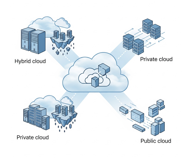 • Hybrid cloud → A mix of private and public clouds for sensitive data and scalable workloads.